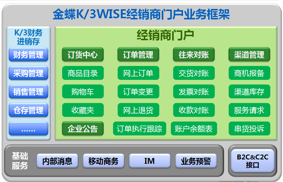經(jīng)銷商管理系統(tǒng)主要以K/3WISE經(jīng)銷商門(mén)戶模塊為主,介紹經(jīng)銷商如何通過(guò)經(jīng)銷商門(mén)戶進(jìn)行溝通、訂貨、退貨、對(duì)賬等,形成金蝶K/3WISE經(jīng)銷商門(mén)戶解決方案。